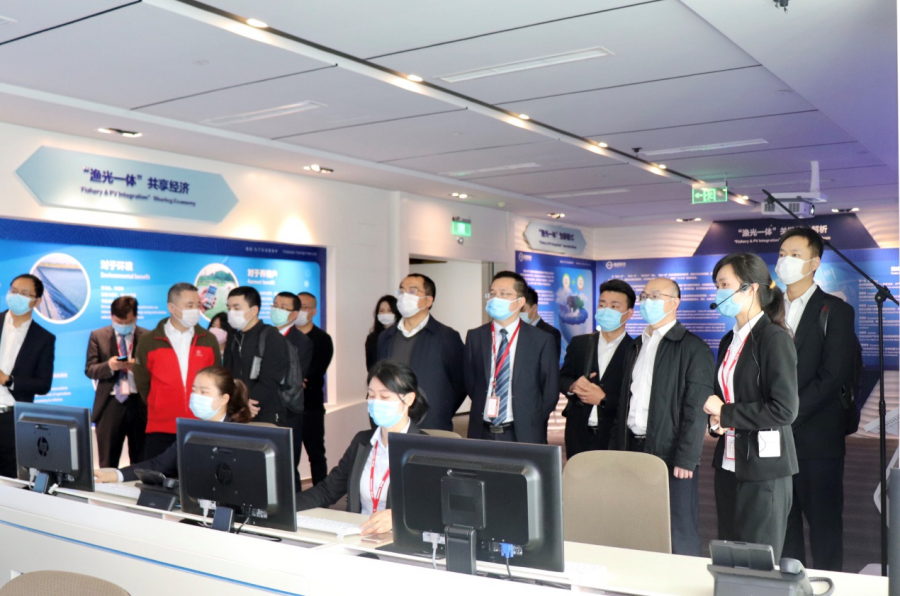 在集控中心,,,,,,,饶勇展示了集控中心的展示功效、故障快速定位功效、实时报警功效,,,,,,,重点先容了通威集团自主定制开发的渔光智能化治理模式,,,,,,,无人机光伏板洗濯、无人机红外线光伏厂区巡检等特色运营模式。。。。。。。